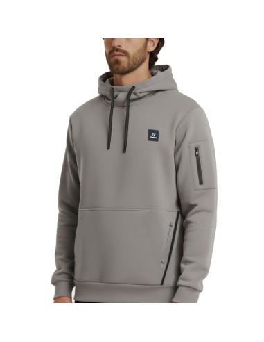 Buzo con hombro caído y capucha. Líneas de diseño en la mitad del cuerpo y diagonales en los laterales con bolsillo y transfer negro.