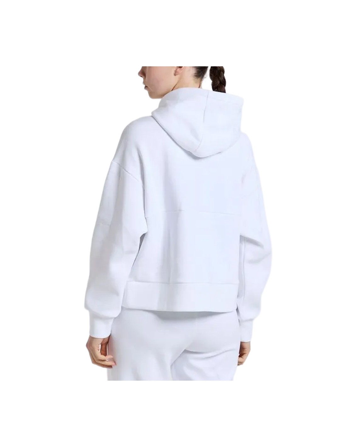 Buzo con hombro caído y capucha. Líneas de diseño en la mitad del cuerpo y diagonales en los laterales con bolsillo y transfer negro
