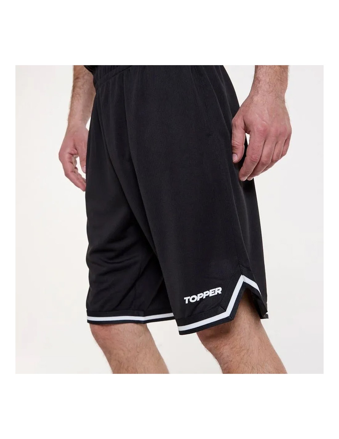 Short largo de mesh con elástico en cintura y bolsillos laterales. Cinta personalizada en dobladillos. Cordón interno de ajuste. Variantes con palabra Topper y con arte de la línea.