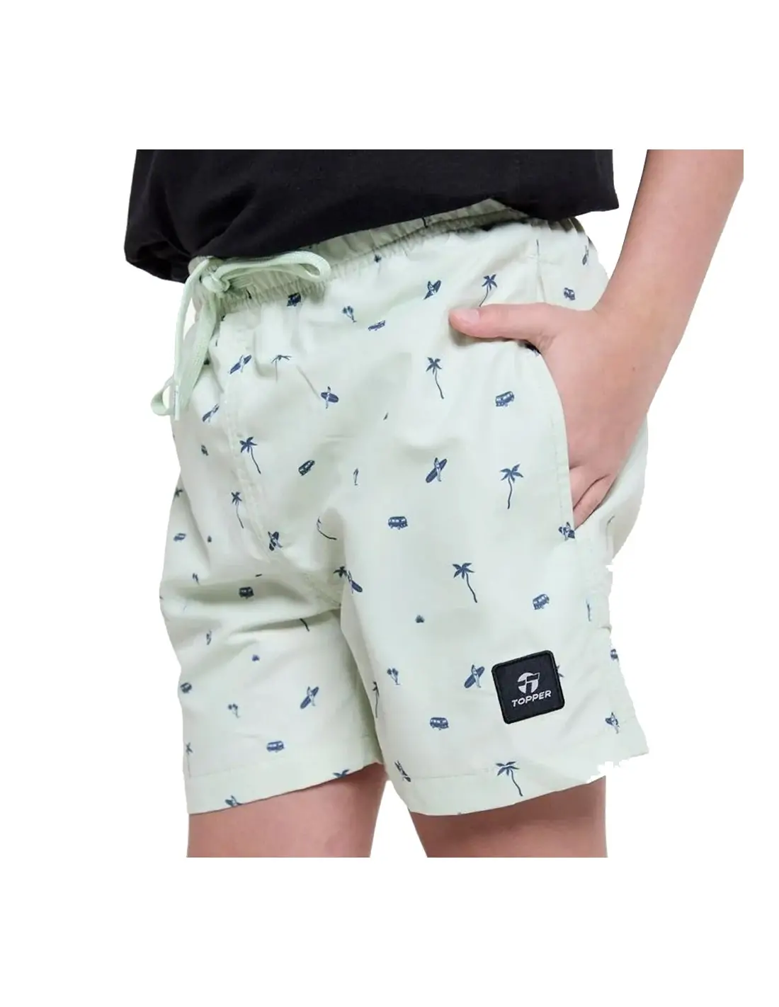 Short de baño corto y entallado. Cintura elastizada, bolsillos laterales y suspensor interno. Cordón para mayor ajuste. Algunas variantes estampadas. Etiqueta de goma Topper Retro.