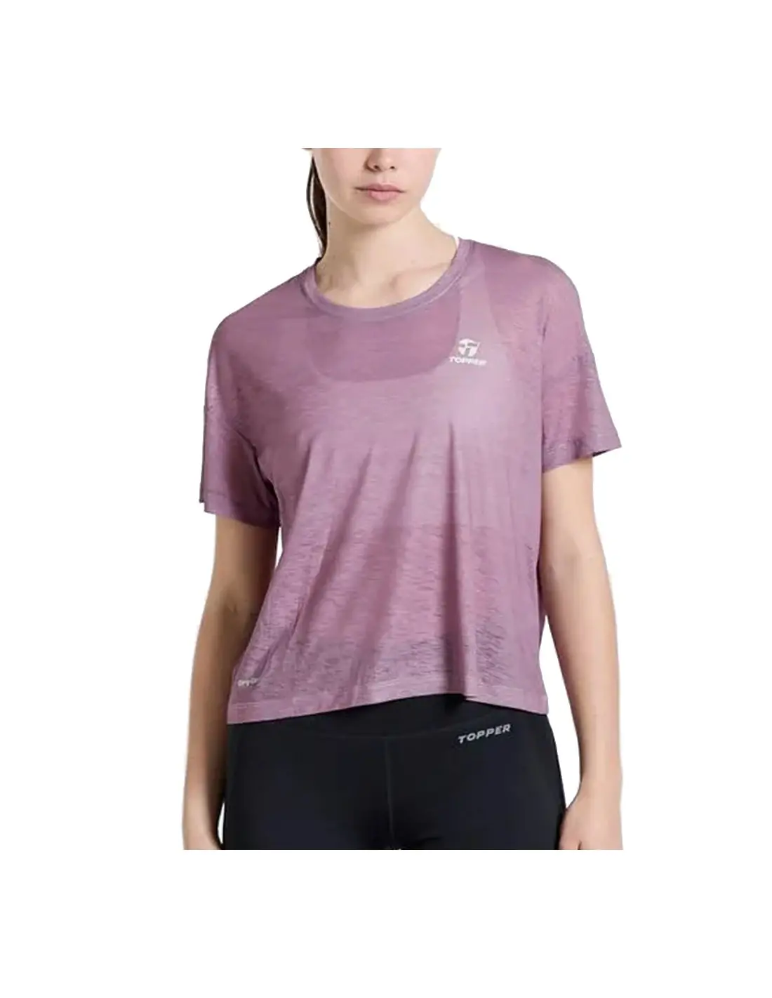 Remera manga corta, calce amplio en el cuerpo y ajustado en la manga. Hombro caido. Realizada en tela con transparencia.